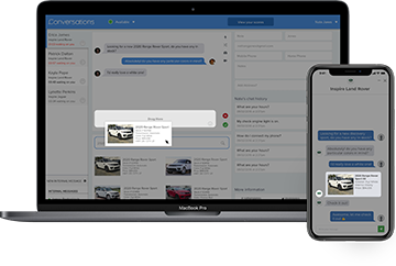 Drag and drop your inventory into chats with interested shoppers, giving them an enticing vehicle snapshot that clicks through to its VDP. Brochures, offers, and videos are also available for instant, effortless sharing.